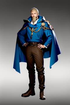 <lora:20250501_AgainGameCharacterLora:1>, 1boy, solo, male focus, facial hair, brown footwear, boots, full body, hands on own hips, cape, standing, belt, blonde hair, looking at viewer, brown belt, beard, pants, grey background, gradient background, long sleeves, bag, simple background,