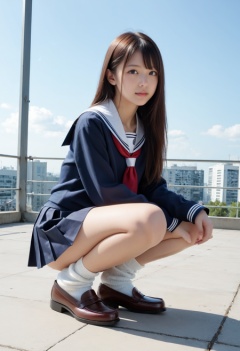 maximum quality, score_9, score_8_up, score_7_up,Maximized quality, selective sharp focus by Nikon-lens,livery, delicate face, analog film, pinup, delicate eyes,hyper photorealistic, sense of everyday life reality,Improved fabric textures, fresh skin, cinematic angle, quality light, dynamic angle, ultra sharp,BREAKthe professional photo of a young Japanese girl,school sailor uniforms, school skirt, loose socks, school loafers, squat on steps,school rooftop
