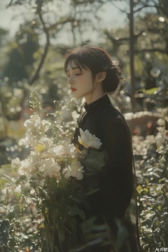 A respectful and atmospheric outdoor portrait. A model with a solemn yet peaceful expression, dressed in elegant, muted colours (perhaps charcoal grey or deep forest green), stands thoughtfully in a beautifully maintained memorial garden or park (avoiding explicit grave markers). She holds a bouquet of white lilies or chrysanthemums. Soft, slightly diffused light, perhaps filtered through trees, creates a poignant atmosphere. The focus is on her respectful posture and the serene beauty of the surroundings, evoking remembrance. High resolution, 8k, natural lighting, hyperrealistic, photorealistic, detailed textures, bokeh background, lifestyle photography, advertisement photography (implied floral/fashion), solemn remembrance, peaceful atmosphere, trending on artstation.