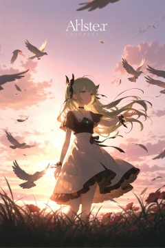 1girl, bird, solo, wrist ribbon, outdoors, sunset, long hair, black ribbon, feathers, ribbon, dress, short sleeves, cloud, tree, sky, floating hair, blonde hair, standing, sun, blue eyes, parted lips, dove, white dress, grass, very long hair, green hair, choker, arm up, white feathers, skirt, necklace, small breasts, green eyes, album cover, diffraction spikes, hair ribbon, collarbone, breasts, jewelry, shirt, high-waist skirt, black shirt, feet out of frame, falling feathers, ahoge, flock, wrist bow, wind, cover, cloudy sky, flower, twilight, blurry, animal, white skirt, blunt bangs, white bird, frills, sunlight, backlighting, lens flare, hand up, dusk, artist name, bow, sunrise, light particles, black bow, outstretched arm, evening, depth of field, closed mouth, copyright name, looking afar, water, horizon, aqua eyes, scenery, blurry foreground, pink sky, arm at side, hair ornament, outstretched hand, hair bow, expressionless, cover page