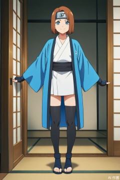 1girl, solo, short hair, looking at viewer, anime style,anime painting,smile,forehead protector, bangs, shirt, brown hair, long sleeves,haori,shirt, blue eyes, ninja sandals,fingerless gloves, black thighhighs, indoors,masterpiece,best quality,amazing quality,masterpiece,best quality,amazing quality,pixiv masterpiece, intricate details, source_anime,score_9, score_8_up, score_7_up, details,score_6_up,intricate details, source_anime,FSW,nicehand,narutoseries