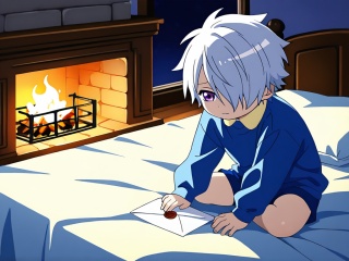 <lora:LB_Lag_Seeing_XL:1>,Lag Seeing,Lag seeing costume,blue clothing,best quality,best detail,masterpiece,male focus,indoors,sitting_on_bed,fireplace,(night:1.1),1boy,(toddler:1.2),male_child,petite,white hair,hair over one left eye,purple eyes,exhausted,letter,perfect hands,(5fingers:1.3),correct anatomy,huge filesize,available light,