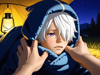 <lora:LB_Lag_Seeing_XL:1>,Lag Seeing,Lag seeing costume,blue clothing,best quality,best detail,masterpiece,male focus,field camp,tent interior,(lantern:0.9),(sleeping bag:0.8),(night:1.1),1boy,male_child,petite,white hair,hair over one left eye,purple eyes,tearing_up,perfect hands,(5fingers:1.3),correct anatomy,huge filesize,available light,photorealistic,