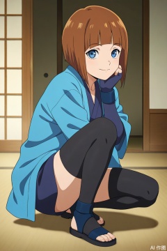 1girl, solo, short hair, looking at viewer, anime style,anime painting,smile, bangs, shirt, brown hair, long sleeves,haori,shirt, blue eyes, ninja sandals,fingerless gloves, black thighhighs, indoors,masterpiece,best quality,amazing quality,masterpiece,best quality,amazing quality,pixiv masterpiece, intricate details, source_anime,score_9, score_8_up, score_7_up, details,score_6_up,intricate details, detailed hands,detailed foot,detailed face,source_anime,FSW,nicehand,narutoseries