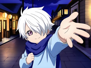 <lora:LB_Lag_Seeing_XL:1>,Lag Seeing,Lag seeing costume,blue clothing,best quality,best detail,masterpiece,male focus,(night:1.1),street,1boy,(toddler:1.1),male_child,petite,white hair,hair over one left eye,purple eyes,smile,beckoning,outstretched one arm,perfect hands,(5fingers:1.3),correct anatomy,huge filesize,available light,