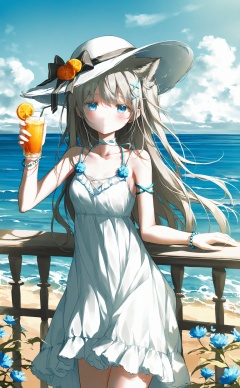 //,1girl, hat, dress, solo, white dress, bracelet, sun hat, blue eyes, long hair, cup, holding, looking at viewer, jewelry, black bow, bow, white headwear, outdoors, holding cup, grey hair, ocean, sky, drinking glass, food, closed mouth, orange (fruit), sleeveless, white choker, sleeveless dress, day, flower, hand up, blue sky, drink, breasts, hat bow, cloud, orange slice, blue flower, fruit, bare shoulders, bead bracelet, sundress, beads, hat ribbon, ribbon, railing, horizon, holding drink, collarbone, water, small breasts, blush, armlet, frills//,<lora:zitonger——【noob】hans:0.9>,