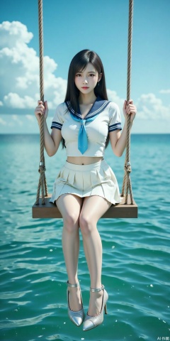 真人肌肤纹理, 4K画质,完美身材,long legs,big_breasts,navel,,Film texture,, film and television, surrealism, a girl with a delicate face is sitting on a cloud swing. The girl is wearing a jk sailor uniform, a white short-sleeved shirt, light blue stripes trimming, a light blue tie, white blue pleated skirt, exquisite diamond-encrusted high heels, swing rope The sub is connected to a cloud in the sky, the background is a vast ocean, the water shows a consistent blue-green tone, the sky is also blue-green, blending with the ocean, perfect light and shadow, hyper-realistic photography, sharpening, artistic conception, Consciousness, large areas of blank space, sense of space, haziness, dreams, fog,