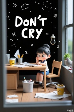 A tilt-shift Q-version scene framed as modern advertising art. At the top, Don't Cry appears in bold yet minimalist white typography against a black background—round lines blend with sharp edges, arranged asymmetrically and accented by hand-drawn strokes and geometric elements. In the center, a chibi girl sits at an office desk cluttered with papers and a smiley mug. She rests one hand on her cheek, balancing a pencil under the other chin, while crumpled sad-face papers fill the trash can beside her. Outside the window, a pigeon perches curiously on the sill, tilting its head toward her contemplative pose. Bright lighting highlights this playful, textured composition for market display.