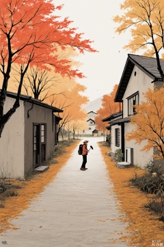 solo, 1boy, hat, holding, male focus, outdoors, day, pants, artist name, bag, from side, tree, facial hair, leaf, brown footwear, backpack, grass, nature, walking, autumn leaves, axe, house, autumn