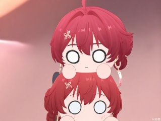 masterpiece,best quality,newest,absurdres,highres,very awa,1girl, danjin, danjin\(wuthering waves\), red hair, chibi, braid buns, blue eyes, simple_background,O O, tuanzi\(wuthering waves\),