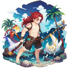 The image depicts a vibrant and dynamic scene with a muscular character wielding a large, ornate mace. The character has red hair and is shirtless, wearing a brown belt with pouches and a white cloth around the waist. The mace is emitting a stream of blue water, which is splashing around the character as they move through the water. The background features a bright, sunny sky with fluffy white clouds, and there are palm trees and a sandy beach visible, suggesting a tropical or island setting. The overall atmosphere is lively and adventurous.sdorica,(simple background,white background:1.2)