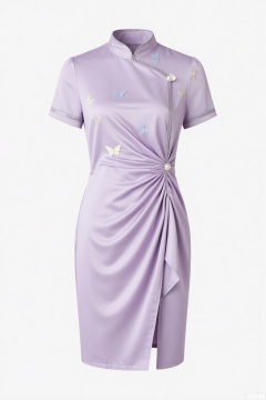 - The dress is adorned with a delicate butterfly pattern in soft, muted tones that blend seamlessly with the light purple base color. The pattern gives the dress a whimsical and feminine touch. The trim around the collar and sleeves is a slightly lighter shade, adding a subtle contrast and enhancing the dress's refined details.
