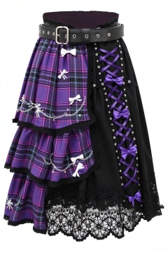 This is a uniquely - designed short skirt. The main body of the skirt consists of two parts: purple plaid and black lace, paired with a wide black belt featuring metal eyelets and a double - buckle design. The purple plaid part has multiple tiers of ruffles, edged with black lace, and embellished with white bow embroidery and chain decorations. The black lace part has purple ribbon criss - cross lacing and several purple bows.