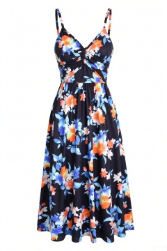 This is a spaghetti - strap dress with a criss - cross V - neck design and slender straps. The whole dress is covered with vivid floral patterns in colors like black, white, blue, and orange, exuding a lively and summery vibe. It has a nipped - in waist and the skirt flares out naturally in an A - line silhouette.