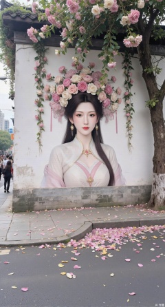 (masterpiece:1.2),best quality,On the front wall,the main body of the wall painting is a portrait of a beautiful woman with long flowing hair.hanfu girl,full body,The hair of the beautiful woman is composed of a large number of luxuriant roses. The flowers are dense and cover the top of the girls head. It seems that I have brought a gorgeous flower hat to the young girl. These flowers cover the whole wall densely. Dense long branches hang down and many petals fall on the ground. The details of the flowers are lifelike,the roots are on one side,the far view is deep,the wide angle is super wide,the real photos,the realistic style,the 32k super clear,and the colors are gorgeous,,XyunyunXY,Xmeining,Xjiangziyue,Xweinina,Xyunxiao,Xxiaoqingxue,Xlenhuan,Xhuajin,Xgufenghuaqiang