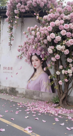 (masterpiece:1.2),best quality,On the front wall,the main body of the wall painting is a portrait of a beautiful woman with long flowing hair.hanfu girl,full body,The hair of the beautiful woman is composed of a large number of luxuriant roses. The flowers are dense and cover the top of the girls head. It seems that I have brought a gorgeous flower hat to the young girl. These flowers cover the whole wall densely. Dense long branches hang down and many petals fall on the ground. The details of the flowers are lifelike,the roots are on one side,the far view is deep,the wide angle is super wide,the real photos,the realistic style,the 32k super clear,and the colors are gorgeous,,XyunyunXY,Xmeining,Xjiangziyue,Xweinina,Xyunxiao,Xxiaoqingxue,Xlenhuan,Xhuajin,Xgufenghuaqiang,XzixiaY