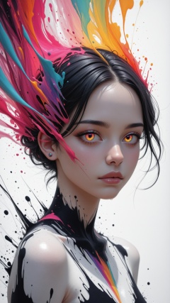 high_quality, highres, beautiful, detailed, (masterpiece, best quality:1.2), absurdres, 8k, HDR,  A striking, surreal portrait of a young woman emerging from a splash of vivid, flowing colors, blending realism with abstract expression. Her face is delicately painted, with intense, piercing eyes that reflect a quiet strength and mystery. The color palette is a mesmerizing mix of electric blues, pinks, and deep purples, creating a sense of energy and contrast that radiates from her. Her dark hair is tousled and appears to be infused with vibrant streaks of paint, blending into the background in dynamic splashes and drips that resemble abstract brush strokes and liquid art. The colors appear as if exploding from her form, giving the impression of movement and transformation, as if she is part of the paint itself. Shadows and highlights on her skin are tinted with these same colors, giving her an otherworldly, ethereal look. The lower part of her figure dissolves into abstract splatters, as if she is fading into or emerging from this colorful chaos. This fusion of realism and abstract splashes conveys a sense of emotion, creativity, and inner strength, with her intense gaze anchoring the viewer amidst the vibrant chaos,, <lora:DetailerV2IL:1>,