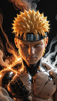 high_quality, highres, beautiful, detailed, (masterpiece, best quality:1.2), absurdres, 8k, HDR, 1boy, A man , close up, solo, naruto uzumaki, dual-tone image,dissolve, smoke, geometric patterns, dynamic posing, black background, neon light, three_quarter_view, <lora:DetailerV2IL:1>,