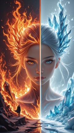high_quality, highres, beautiful, detailed, (masterpiece, best quality:1.2), absurdres, 8k, HDR,  1boy, 1 woman , overlapped ,neon reflections , digital soul, soft brushstrokes ,complimentary colors, dual-tone image, elements, fire and ice, splitscreen, dynamic posing, three_quarter_view, ribbon in hair, long bangs,  <lora:EffectboosterIL:1>
