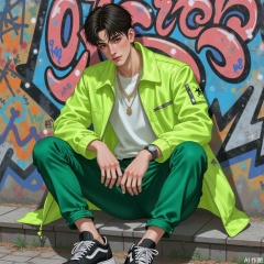 A young man sits in front of a graffiti wall. Wearing a green fluorescent coat, white sweatshirt, green pants, and a watch on his wrist. He was wearing blue jeans on his feet. He was wearing black and white sneakers. The graffiti wall in the background is covered with graffiti of various colors, adding to the atmosphere of street art.