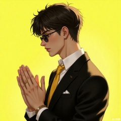 solo, short hair, shirt, black hair, long sleeves, 1boy, jewelry, closed mouth, jacket, white shirt, upper body, male focus, necktie, collared shirt, dark skin, bracelet, from side, black jacket, hands up, profile, formal, sunglasses, dark-skinned male, own hands together, suit, yellow background, backlighting, yellow necktie, praying