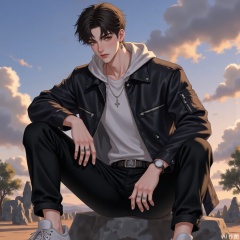 solo, looking at viewer, short hair, black hair, long sleeves, 1boy, jewelry, sitting, jacket, male focus, earrings, outdoors, sky, shoes, belt, pants, cloud, hood, necklace, tree, hoodie, black pants, white footwear, ring, hood down, denim, ground vehicle, sneakers, motor vehicle, knee up, pocket, sunset, watch, wristwatch