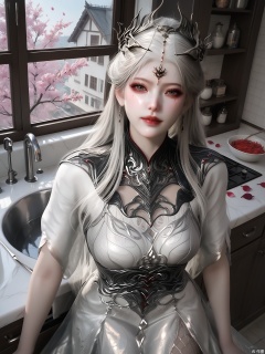 score_9,score_8_up,score_7_up,1girl,looking_at_viewer,realistic,1girl,Vivid Colors,bright environment,delicate water,hair_ornament,shiny skin,shiny hair,reflection,(wariza:1.2),dress,jewelry,flower sea,falling petals,extreme detail description,(full body:0.4),put one hand on your side,long_hair,(skindentation:1.3),Fishnet stockings,bright,sunshine on face,white dress,chinese_clothes,white-hair,kitchen,brown_eyes,