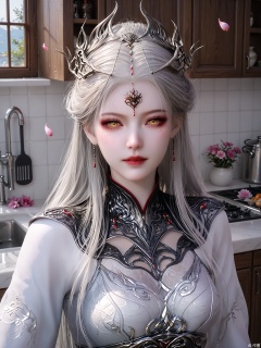 score_9,score_8_up,score_7_up,1girl,looking_at_viewer,realistic,1girl,Vivid Colors,bright environment,delicate water,hair_ornament,shiny skin,shiny hair,reflection,(wariza:1.2),dress,jewelry,flower sea,falling petals,extreme detail description,(upper body:1),put one hand on your side,long_hair,(skindentation:1.3),Fishnet stockings,bright,sunshine on face,chinese_clothes,kitchen,Portrait,yellow_eyes,face forcus