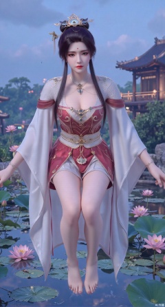 SFW,(masterpiece:1.2),best quality,1girl,solo,long hair,long dress,celestial maiden in flowing tulle gown levitates above lotus pond, ethereal mist trails from hair ribbons, mythical Penglai paradise emerges through clouds with glowing pavilions, translucent bioluminescent lotus blooms, , ultra HD with soft 3D rendering, morning light filters through mist, falling petal rain,.(huge breasts:2.99),(full breasts:2.99),(Background with lotus pond and pink lotus flowers:1.39),XyunyunXY,Xmeining,Xjiangziyue,Xweinina,Xhuajin