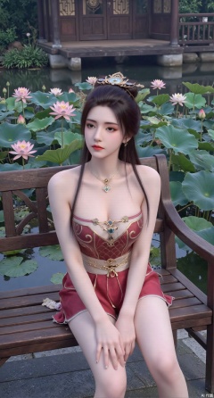sfw,(masterpiece:1.2),best quality,a young woman sitting on a wooden bench in a pond with lily pads.The woman is posing with one hand on her hip and the other resting on the edge of the bench. The background is filled with pink and white lotus flowers and green leaves. The overall mood of the image is peaceful and serene,(huge breasts:2.99),(full breasts:2.99),(Background with traditional Chinese architecture, lotus pond and pink lotus flowers:1.39),XyunyunXY,Xmeining,Xjiangziyue,Xweinina,Xyunxiao,Xxiaoqingxue,Xlenhuan,Xbabata,Xhewanyuzhiyao,XzixiaY,Xqinyao,Xaichen