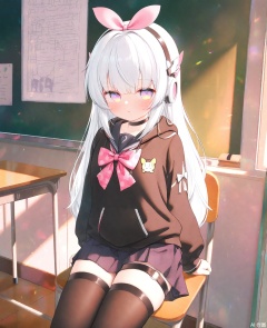 masterpiece,high quality,best quality,1loli,sit on the chair,baby fat,ong hair,bangs,skirt,thighhighs,long sleeves,bow,purple eyes,multicolored eyes,white hair,hair bow,bag,choker,black choker,black thighhighs,hood,thigh strap,hair ornament,headphones,school_uniforms,serafuku,catfox,in classroom