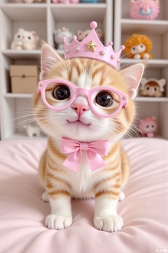 Realistic style, a one-month-old kitten, its breed is a golden tabby cat, wearing pink round-frame glasses, wearing a pink crown tied with a pink bow, the background is an indoor environment, with shelves and stuffed toys, the picture style is cute, the color is soft, using realistic rendering