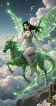 n a sky filled with flowing leyline clouds, a graceful beauty rides a sacred leyline beast soaring through the skies. Her black hair flows like a leyline, its strands shimmering with vibrant green glow, as if the Milky Way and earth intertwine. Behind her, a pair of crystal wings unfolds, composed of transparent leyline crystal gemstones, each gemstone refracting a green glow, as if leyline energy flows in the air. The edges of the wings are embedded with flowing leyline energy, gently flapping as she moves, leaving a trail of vitality in the air. She wears a rainbow gradient crystal gemstone dress, the skirt made of transparent leyline gemstones, their light constantly changing as she moves, casting a dreamlike rainbow glow. The dress hugs her curves, showcasing her sexy yet elegant figure, with a few leyline petals adorning the hem, gently swaying in the breeze, complementing her wings and dress. She rides a leyline Dragon, a divine beast made of green leyline energy, its body shimmering with dazzling green glow, its hooves stepping on flowing leyline energy, as if treading on the void. The beast’s mane flows like a waterfall of leyline, radiating a rich earth aura, its eyes like two radiant stars, exuding a majestic aura. Its wings are composed of leyline crystal gemstones, the edges embedded with flowing leyline energy, gently flapping as it flies, leaving a trail of vitality in the air. The sky above the clouds is filled with a fresh leyline aura, within which one can faintly see fantastical leyline flowers, their shapes crystal-clear, petals dotted with dew, exuding a rich magical aura. Countless glowing runes float in the sky, emitting a mysterious light, as if whispering ancient spells. Her face is exquisitely beautiful, her skin smooth and flawless like fine porcelain, her eyebrows and eyes painted like a masterpiece, her gaze as dazzling as the stars, revealing a hint of mystery and allure. Her makeup is exquisite, her lips vibrant green, her mouth slightly curved, carrying an imperceptible smile, exuding an irresistible charm. Her face is surrounded by a leyline halo, as if starlight flows on her face.