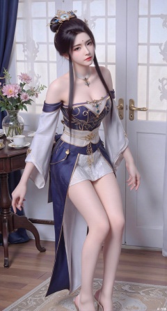 (masterpiece:1.2),Ultra clear, wallpaper, 8k, masterpiece, 1girl, solo, long hair, breasts, looking at viewer, bangs, large breasts,long dress,, bare shoulders, jewelry, black hair, standing, purple eyes, full body, flower, thighs, indoors, hair bun, long dress, high heels, cup, see-through, book, bare legs, window, table, white footwear, standing on one leg, curtains, pink flower, side slit, vase, ,(huge breasts:2.99),(full breasts:2.99)),,XyunyunXY,Xmeining,Xjiangziyue,Xweinina,Xyunxiao,Xxiaoqingxue,Xlenhuan,Xhuajin