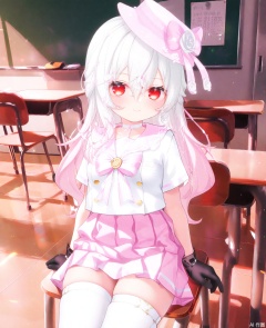 masterpiece,high quality,best quality,masterpiece,high quality,best quality,1loli,sit on the chair,writing on the desk,solo,long hair,breasts,red eyes,gloves,hat,hair between eyes,jewelry,earring,pink hair,white hair,multicolored hair,gradient hair,black gloves,school_uniform,serafuku,thighhighs,loafers,thigh strap,Tokitamashi,in classroom