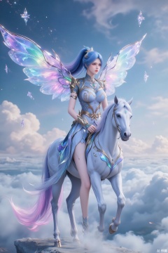 In a cloud-filled sky intertwined with dazzling auroras and vibrant colors, a graceful beauty engages in a dreamy interaction with a sacred multicolored cloud-borne steed. Her blue hair is tied into a high ponytail, its strands shimmering with faint starlight, as if auroral power dances in the air. Her smooth, pearl-like skin is adorned with a high-collared dress made of rainbow gradient crystal gemstones, its design elegant and exquisite, the high collar adding an air of mystery, as if auroral and colorful elements flow over her body. Behind her, a pair of auroral crystal wings unfolds, composed of transparent auroral crystal gemstones, each gemstone refracting a deep, purple-blue glow, while also embedded with vibrant colors, as if auroral power and colorful elements flow in the clouds. The edges of the wings are embedded with flowing auroral energy, gently flapping as she moves, leaving a mysterious and dazzling trail in the sky. She rides a sacred multicolored cloud-borne steed, a divine beast made of pure cloud mist and auroral power, its body shimmering with vibrant rainbow hues, as if auroral power and colorful elements dance in the clouds. The steed’s mane flows like an aurora, radiating a soft and dreamy light, each strand refracting different colors, ranging from deep purple-blue to radiant gold, gentle pink, and lush green, as if presenting a feast of colors. The steed’s eyes are like two radiant stars, its pupils radiating a gentle light, exuding a serene and sacred aura, as if silently conversing with her. Its hooves are composed of auroral crystal gemstones, the edges embedded with flowing auroral energy, gently stepping as she rides, as if leaving dreamy footprints in the clouds. The cloud-filled sky is filled with a rich auroral aura, within which one can faintly see fantastical auroral flowers, their shapes crystal-clear, petals dotted with auroral energy and vibrant rainbow hues, exuding a powerful magical aura. Countless glowing runes float in the clouds, emitting a mysterious light, as if whispering ancient spells. Her face is exquisitely beautiful, her skin smooth and flawless like fine porcelain, her eyebrows and eyes painted like a masterpiece, her gaze as dazzling as the stars, revealing a hint of mystery and tenderness. Her makeup is exquisite, her lips purple-blue, her mouth slightly curved, carrying an imperceptible smile, exuding an irresistible charm. Her face is surrounded by an auroral halo, adorned with vibrant rainbow hues, as if starlight flows on her face.