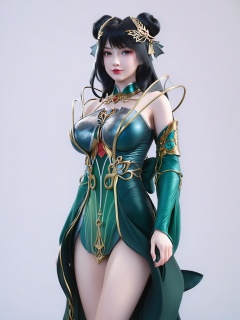 score_9,<lora:SF_HangFuLing2_Pony_Realism2.3-000004:0.7>,1girl,breasts,large breasts,standing,hair ornament,solo,lipstick,black hair,dress,jewelry,detached sleeves,green dress,double bun,skirt,cowboy shot,bare legs,looking at viewer,white background,simple background,