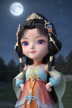 score_9,1girl,solo,shiny,shiny_hair,score_9,upper_body,portrait,fair_skin,white_skin,shiny_skin,shiny,Ivory_skin,looking at viewer,cinematic lighting,volumetric lighting,solo focus,blurry background,depth of field,night,sky,night sky,full moon,(huge planetary background:1),moonlight,<lora:绝世战魂-迷你妙妙:0.7>,long,flowing black hair adorned with an ornate golden tiara,purple eyes,flowing,ethereal dress with intricate designs and colors that include gold,orange,and pale blue. high collar,bell sleeves,flowing skirt with a golden sash.,