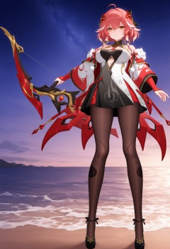 front view,from_below,full_body,bow_(weapon),archery,solo,beach,ocean,waves,gradient_sky,starry_sky,dusk,in summer,<lora:长离师尊:1>,changli,1girl,long hair,bangs,hair ornament,big breasts,ribbon,hair between eyes,bare shoulders,yellow eyes,ahoge,red hair,short hair,multicolored hair,highlighted hair,pink hair,flower,hair flower,lace stockings,exposed,sexy,<lora:锦龙吟:1>,jly,long sleeves,dress,pantyhose,black pantyhose,brown pantyhose,capelet,jacket,white jacket,fur trim,shoes,footwear,black footwear,platform footwear,heels,high heels,platform heels,