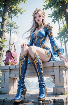 The image depicts a digitally rendered character sitting on a white stone structure. The character is adorned in an elaborate outfit featuring a blue and gold ensemble with intricate patterns and embellishments. The character has long, flowing blonde hair and is wearing a golden crown. The outfit includes a short blue top with gold accents, a short blue skirt with gold trim, and ornate golden arm and leg accessories. The character is also wearing large, stylish boots with blue and gold designs. The background shows a bright, natural setting with sunlight filtering through trees, creating a serene and ethereal atmosphere. There is a pink and gold bag placed on the stone structure next to the character.