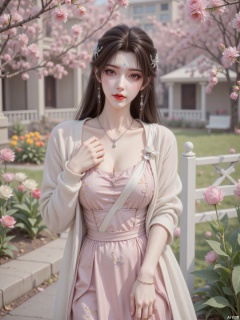 The bright sunlight shone through the cherry blossom trees in the garden, sprinkling mottled light and shadow on her body. The pink cherry blossoms fell in the wind, falling on her shoulders and hair. Surrounded by blooming tulips and roses, flowers of all colors compete for beauty, in the distance there is a white carved fence, outside the fence is a large green lawn, with colorful picnic mats and flower baskets dotted on the lawn. The whole scene is full of the brightness and vitality of spring, but it adds unique charm to its cold temperament. "