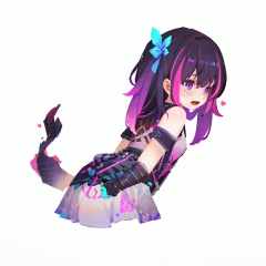 1girl, solo, long hair, looking at viewer, smile, bangs, black hair, dress, bow, very long hair, purple eyes, pink hair, purple hair, short sleeves, heart, multicolored hair, looking back, virtual youtuber, tears, from behind, streaked hair, one side up, suspenders, crying, pink dress, crying with eyes open,moyou,sdorica,(simple background,white background:1.2)