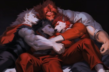 The image depicts a muscular man lying down, surrounded by three large wolves. The man has a red mohawk and is wearing a gray shirt and red pants. The wolves are gray with white accents, and they appear to be cuddling around the man. The background is dark, with a red hue that contrasts with the wolves and the man. SVG FURRY,furry