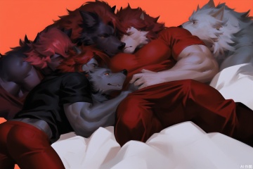 The image depicts a muscular man lying down, surrounded by three large wolves. The man has a red mohawk and is wearing a gray shirt and red pants. The wolves are gray with white accents, and they appear to be cuddling around the man. The background is dark, with a red hue that contrasts with the wolves and the man. SVG FURRY,furry