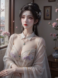 The soft morning light shines in from the antique flower window on the left, and the window lattice casts diamond-shaped light and shadow on the ground. Some of the light penetrates the woman's yarn-like armor, forming a soft halo on the surface of the clothes, and subtle golden dust floats in the air, adding a sense of dreaminess. The picture adopts the new Chinese style fine brushwork and heavy color artistic style. The background is an antique study room. The wall is hung with ink and water landscape paintings. The ancient shelf is placed with blue and white porcelain vases and bronze ware. A pot of blooming white peonies is placed on the flower table by the window. Outside the window, the outline of the Jiangnan courtyard with blue tiles and white walls can be seen vaguely, and several pink peach blossoms are poked out of the wall.