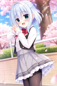quality,amazing quality,very aesthetic,absurdres,1girl,asu \(vtb\),solo,skirt,blue hair,pantyhose,cherry blossoms,open mouth,blush,smile,bow,outdoors,grey skirt,frills,looking at viewer,long sleeves,red bow,pleated skirt,:d,bowtie,black pantyhose,bangs,shirt,day,white shirt,red bowtie,hair intakes,green eyes,petals,school uniform,hair between eyes,ribbon,vest,blurry,short hair