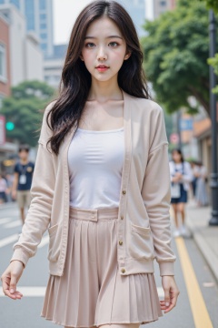 The image is a high-resolution photograph taken in an urban setting, likely a city street. The main subject is a young Asian woman with long dark black hair, walking confidently down the sidewalk. She is wearing a trendy spring outfit: a light cardigan with a T-shirt, paired with a high-waisted pleated short skirt that reaches her ankles. Her makeup is subtle yet polished, with a focus on her lips, which are painted a soft pink, looking at viewer, In the background, The background features buildings and trees, cityscape, The street is paved with grey concrete, and there are visible pedestrian crosswalks. The overall mood of the image is modern and casual, with a focus on everyday city life.