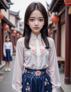 This photograph features a young girl with long, straight black hair and fair skin, standing on a traditional Chinese street. She wears a white blouse with intricate floral embroidery and a high-waisted, navy-blue skirt adorned with floral patterns. The street is lined with red lanterns and traditional wooden buildings, with another girl in the background. The scene is well-lit, suggesting daytime.