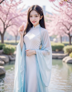 This is a high-resolution photograph featuring a young Asian woman standing in a serene outdoor setting, likely a garden or park, during springtime. She is dressed in a traditional Chinese qipao, a long, flowing gown with a high collar and wide sleeves. The gown is made of a soft, pastel blue fabric with a subtle gradient, transitioning from a pale blue at the top to a deeper, more vibrant blue at the bottom. The sleeves are long and loose, with white linings that add a touch of contrast.The woman has long, straight black hair, styled with a traditional hairpin, and she wears a gentle, natural smile. She holds a single peach blossom petal in her right hand, delicately lifting it towards her face. The background showcases a serene pond with gently rippling water, and the surrounding area is adorned with blooming cherry blossom trees, their branches laden with soft flowers. The sky above is clear and bright, suggesting a sunny day. The overall atmosphere of the photograph is calm, peaceful, and full of natural beauty, enhanced by the soft pastel colors and the delicate textures of the fabric and peach blossoms.