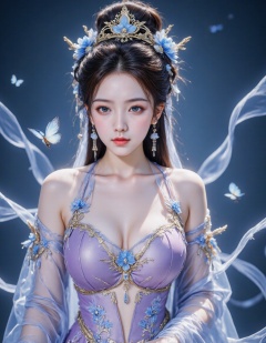 This is a highly detailed digital illustration of a young woman with an ethereal, otherworldly appearance. She has fair skin, large, almond-shaped eyes with subtle makeup, and full, pink lips. Her long, dark hair is styled in an intricate updo adorned with blue and gold floral hair accessories, including a delicate crown. She wears an elaborate, form-fitting dress in shades of lavender and blue with intricate gold embroidery. The dress features a plunging neckline that accentuates her ample breasts, and it is adorned with floral motifs and gemstones. The background is a deep, gradient blue, enhancing the ethereal atmosphere. Soft, wispy blue and white ribbons swirl around her, adding to the mystical feel. A small, blue butterfly flutters near her left shoulder, and more butterflies are visible in the background, adding to the whimsical and magical ambiance. The woman’s expression is serene and slightly melancholic, with a slight tilt of her head, adding to her enigmatic presence. The overall style is a blend of fantasy and traditional East Asian aesthetics, with a high level of detail and realism in the clothing and accessories.